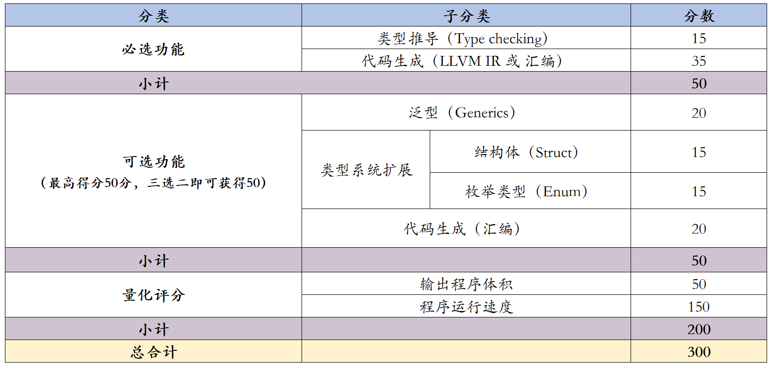 可选功能中的代码生成测试只接受生成RISCV64GC汇编,并根据汇编程序的测试通过率进行评分。比赛中的所有其余测试均可以接受LLVM IR和RISCV64GC输出格式的任意一种,且使用两者的得分没有区别。 在量化评分的测试中,有一部分测试将同时包含一种或以上的可 选语言特性,参赛者的编译器必须同时实现了所有要求的语言特性才能通过这些测试。