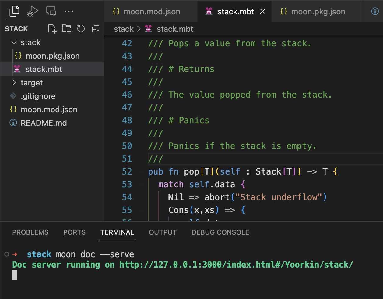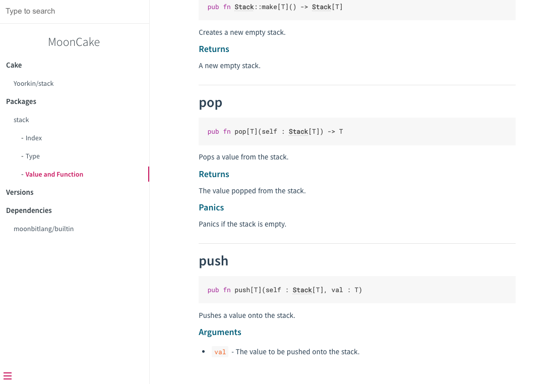 添加 moon doc 命令,用于生成和预览文档。moon doc --serve会根据代码中的markdown注释生成文档,并在本地启动网页服务器。访问输出的链接即可查看效果。