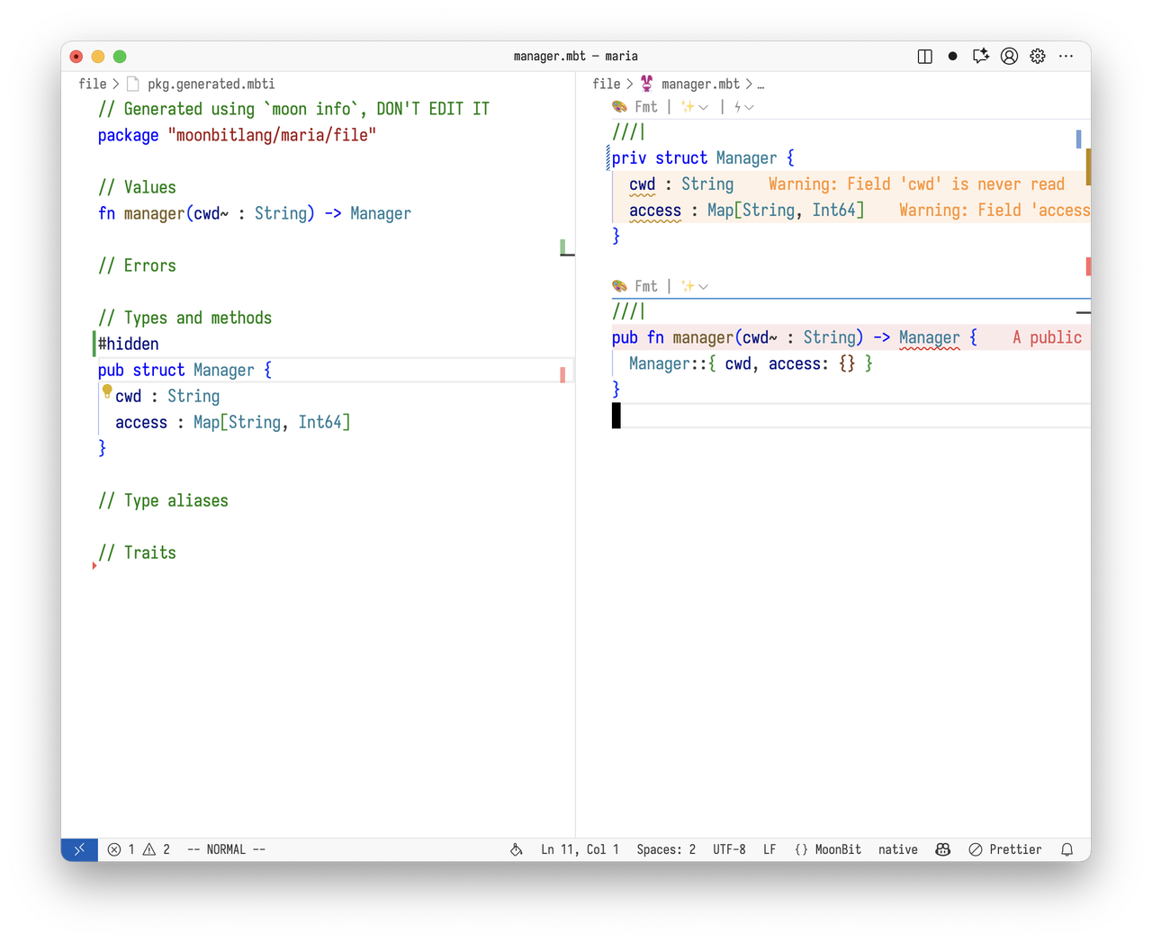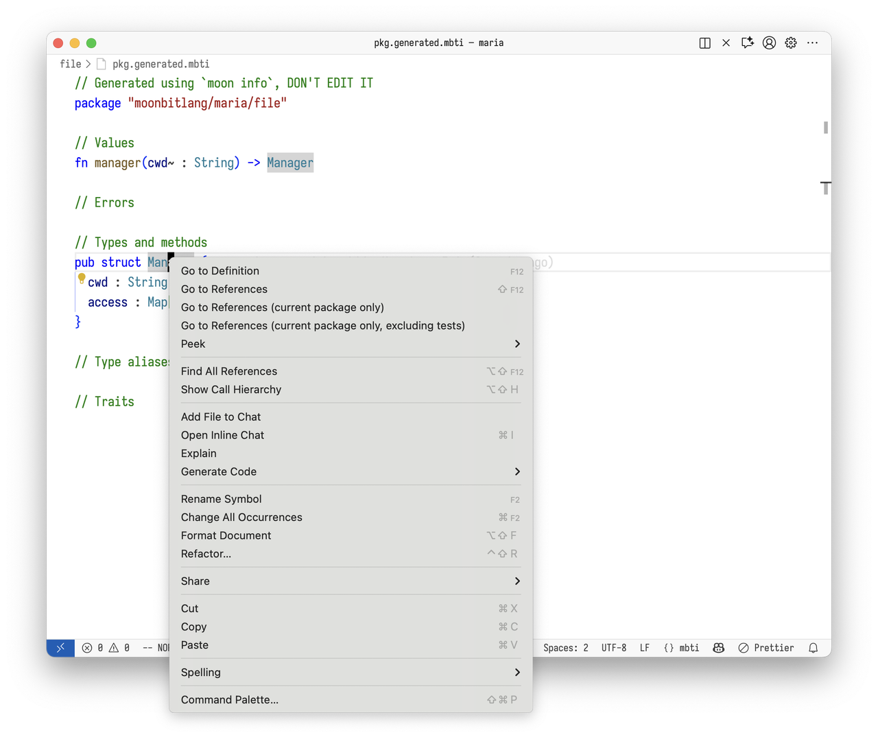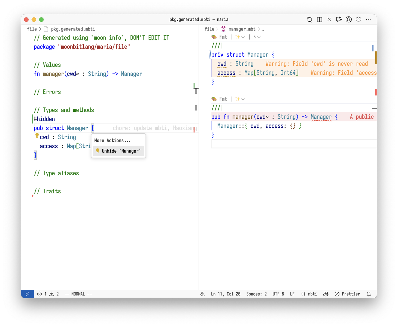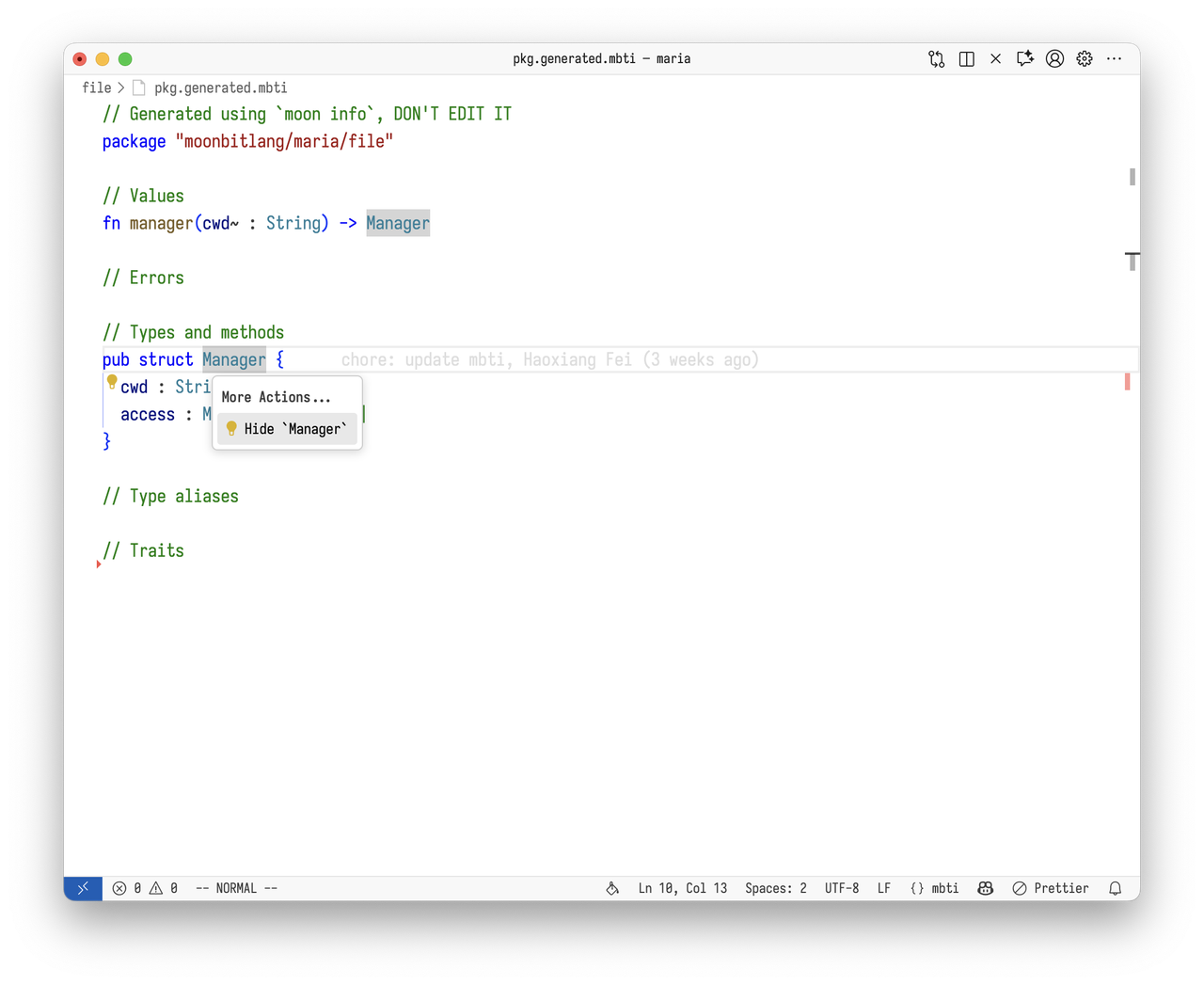 1. 弃用 moon info --no-alias。在上次月报中,我们增加了 moon info --no-alias的功能,用于生成不包含默认 alias 的 pkg.generated.mbti 文件: